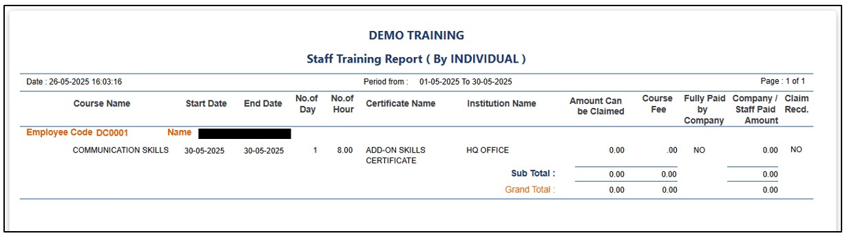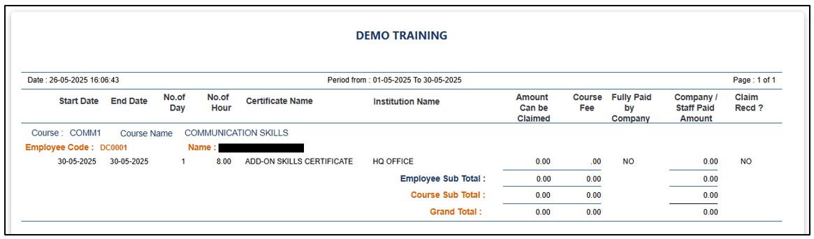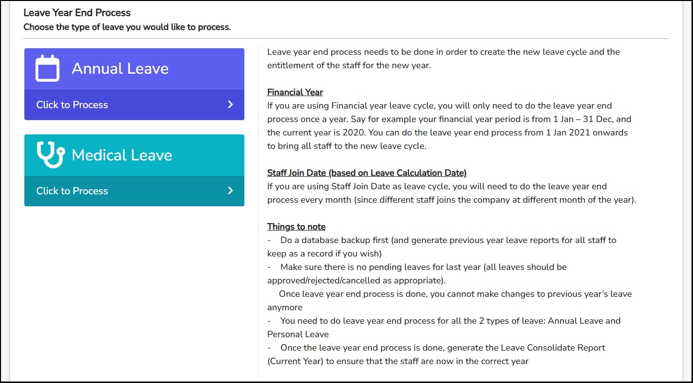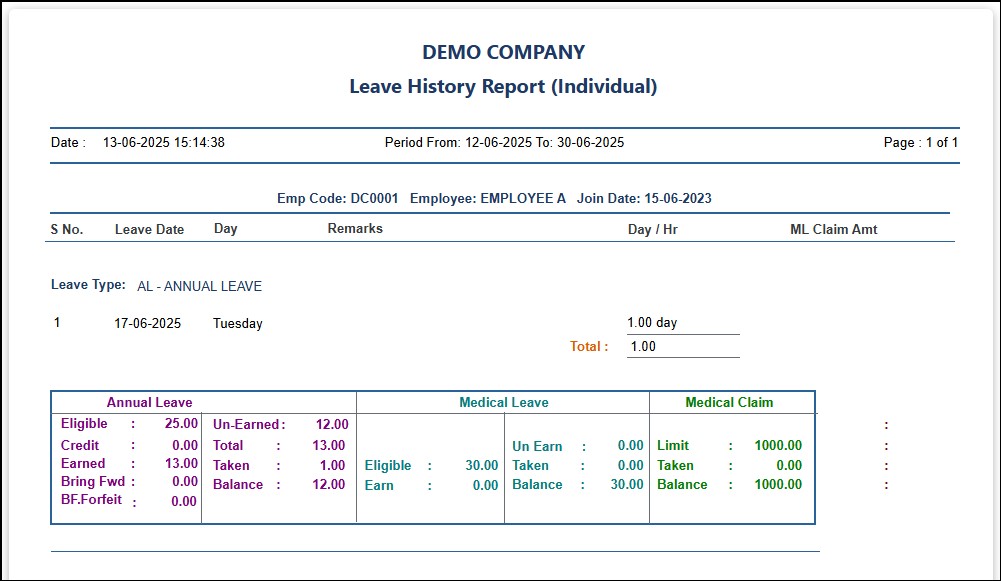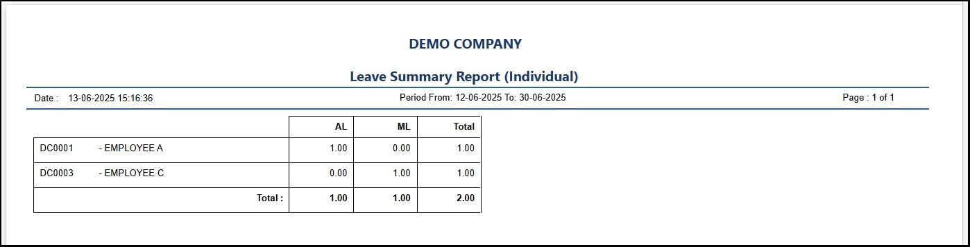 This report is to generate the total leave taken by the employees for Annual Leave and Medical Leave during the selected period.