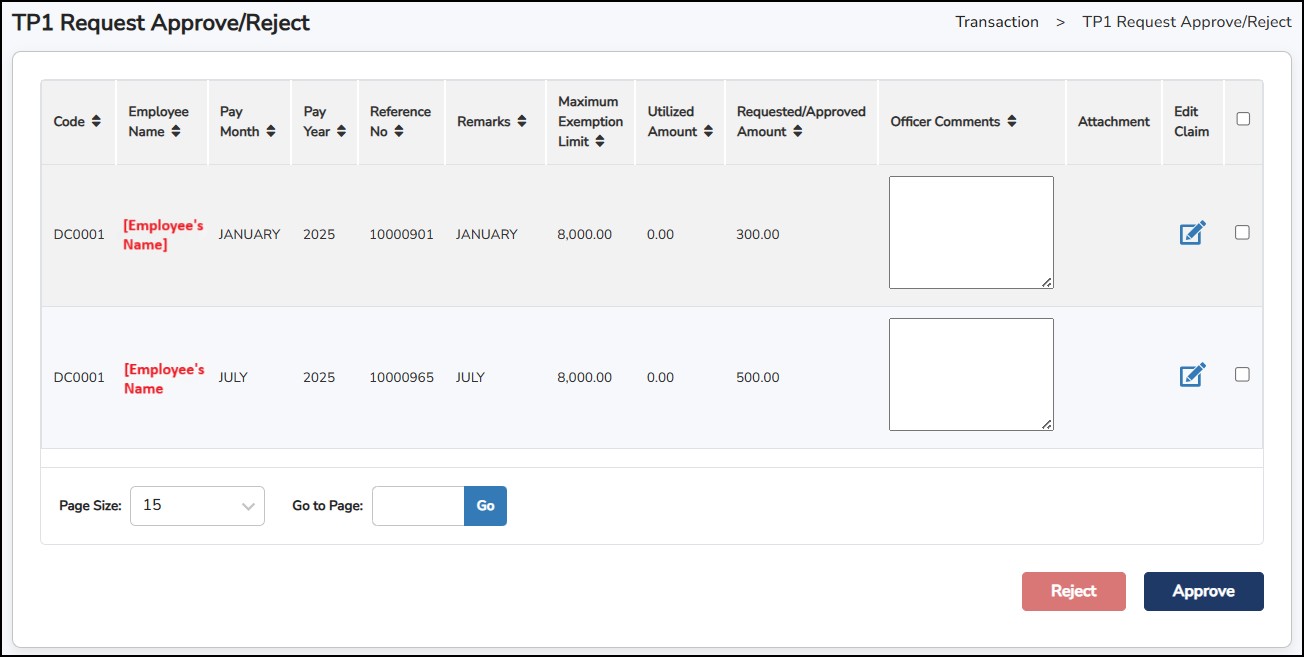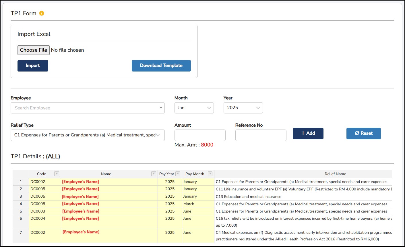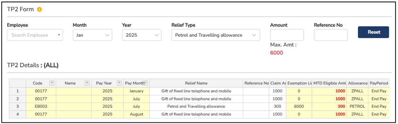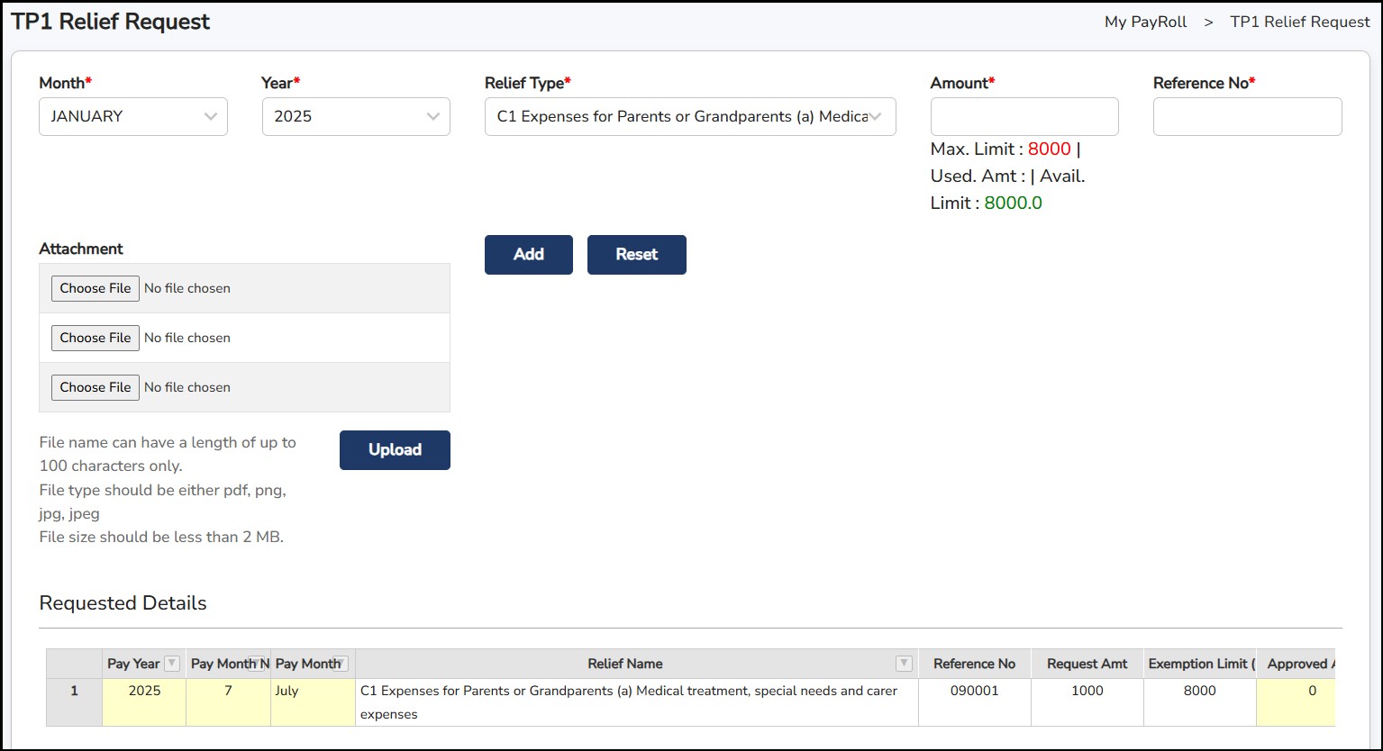 Use this function to request updates for any Tax Relief in the system. Once submitted, your HR/Admin will review and either approve or reject the request.