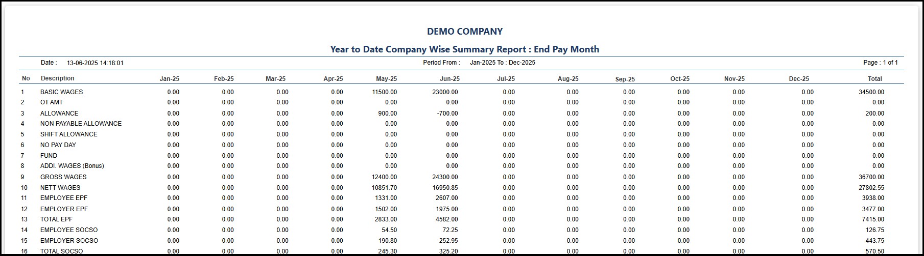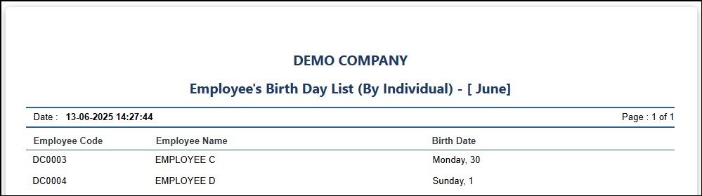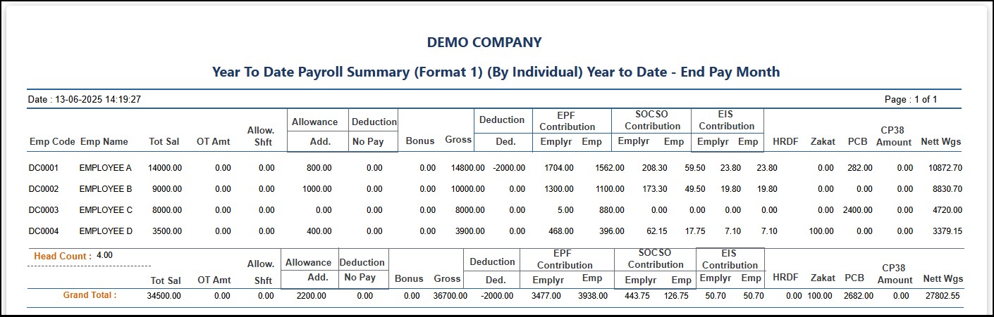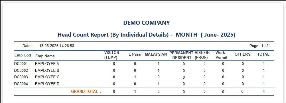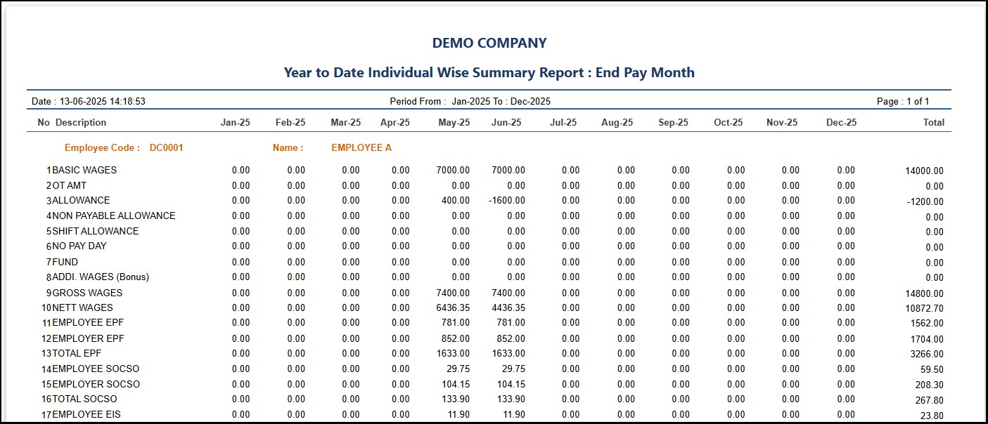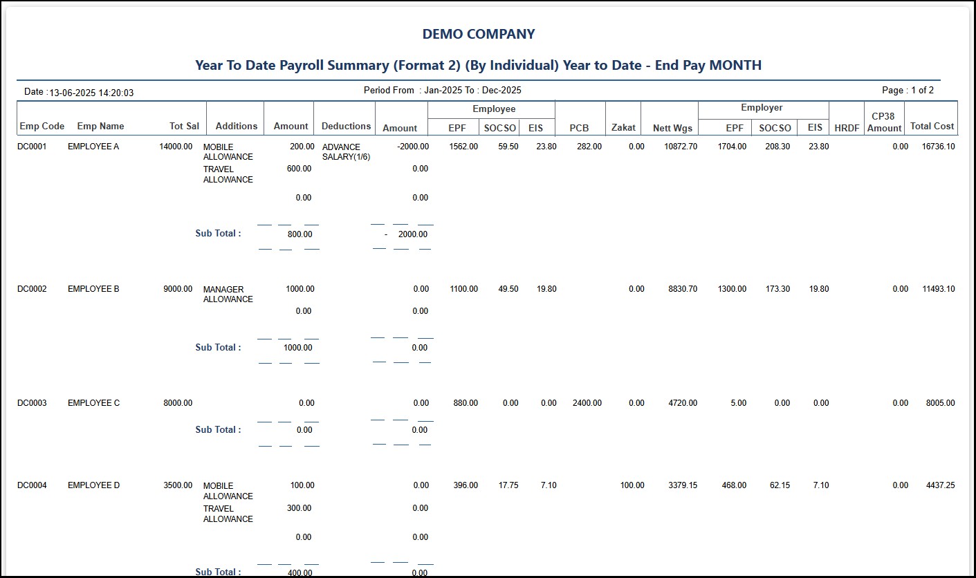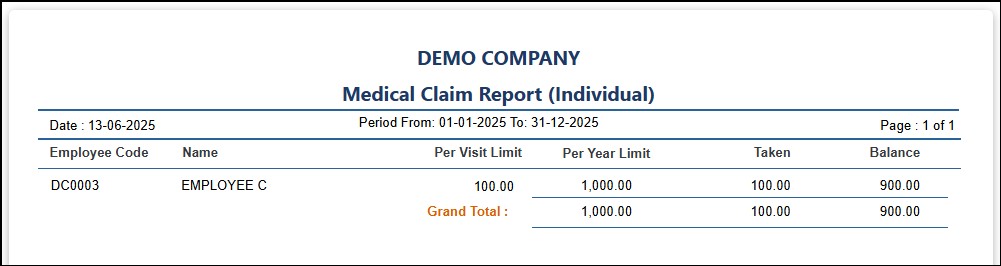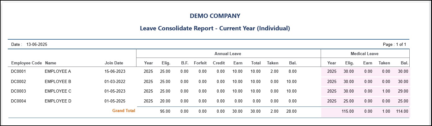 This report provides a detailed summary of each employee's annual and medical leave records for the current year. It allows HR and managers to monitor leave entitlements, usage, and remaining balances in real time.