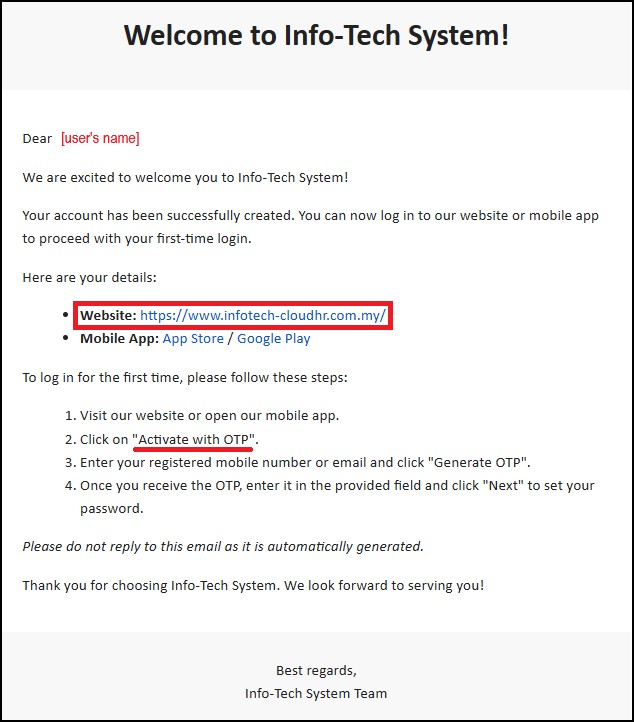 The user will then receive the notification/welcome email as below, indicating the account has been created. User will need to proceed to activate their account by clicking on the "Activate with OTP". Proceed with following the steps and set the 1st time password for the account.