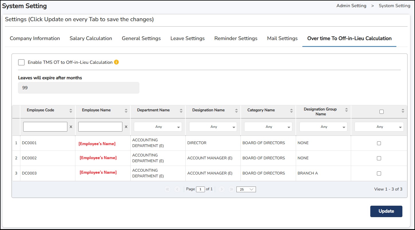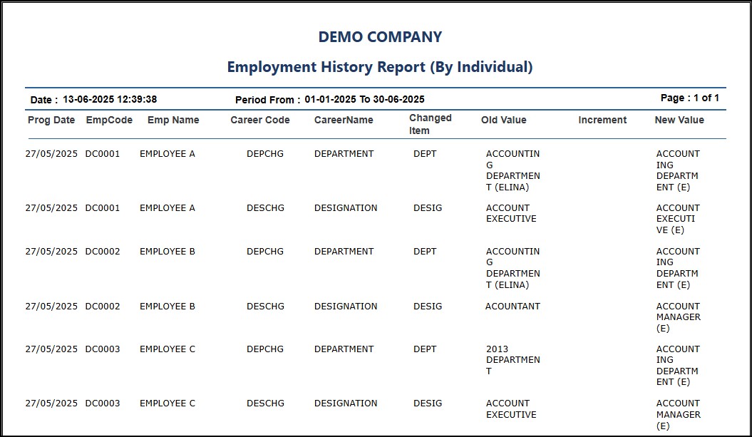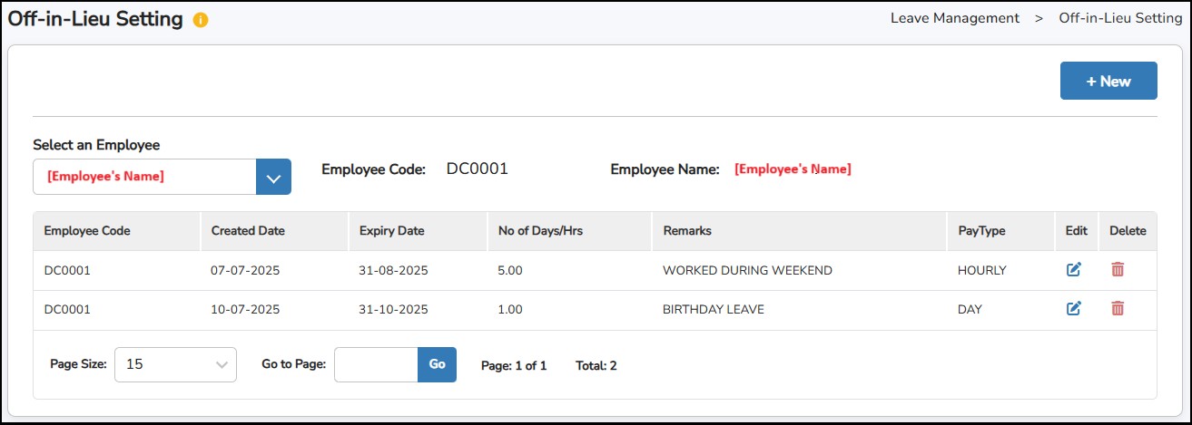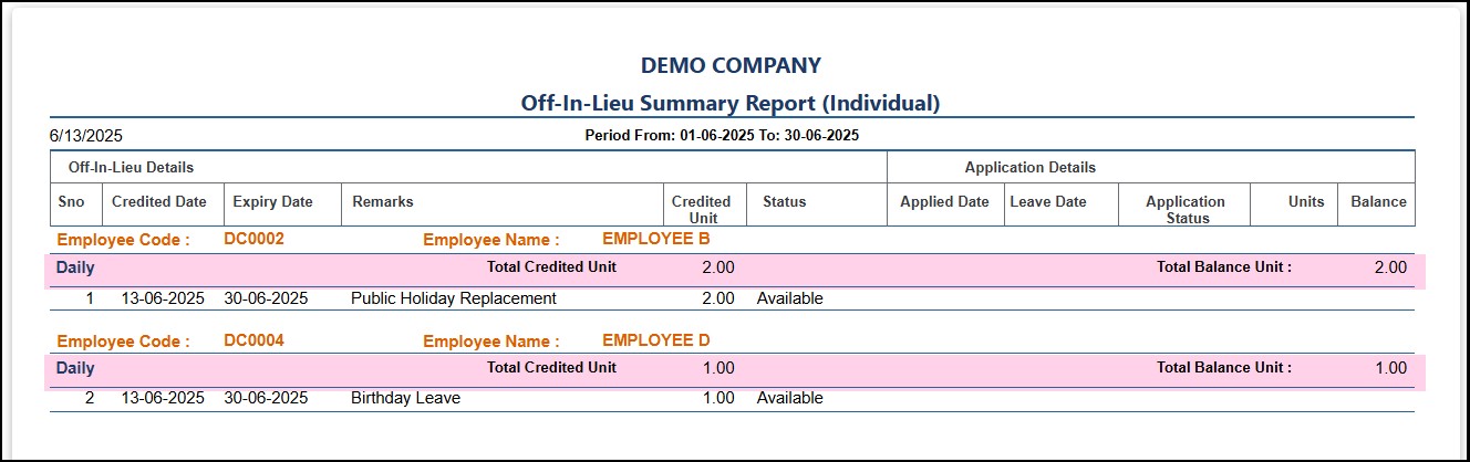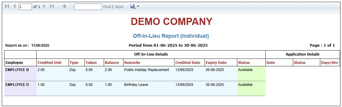 This report is to display the detailed report Off-In-Lieu (Replacement Leave) credited to the employees during the selected period including the credited date and the expiry date of the replacement leaves.