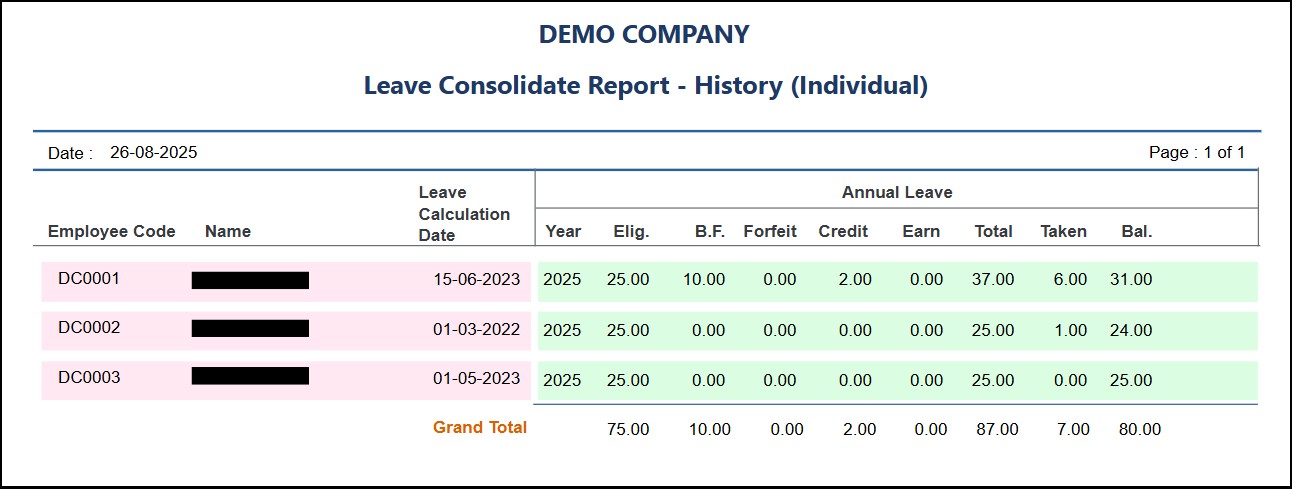 This report provides a consolidated view of each employee's annual leave records for a specific year. It helps to track leave entitlements, usage, and remaining balances for individual employees.