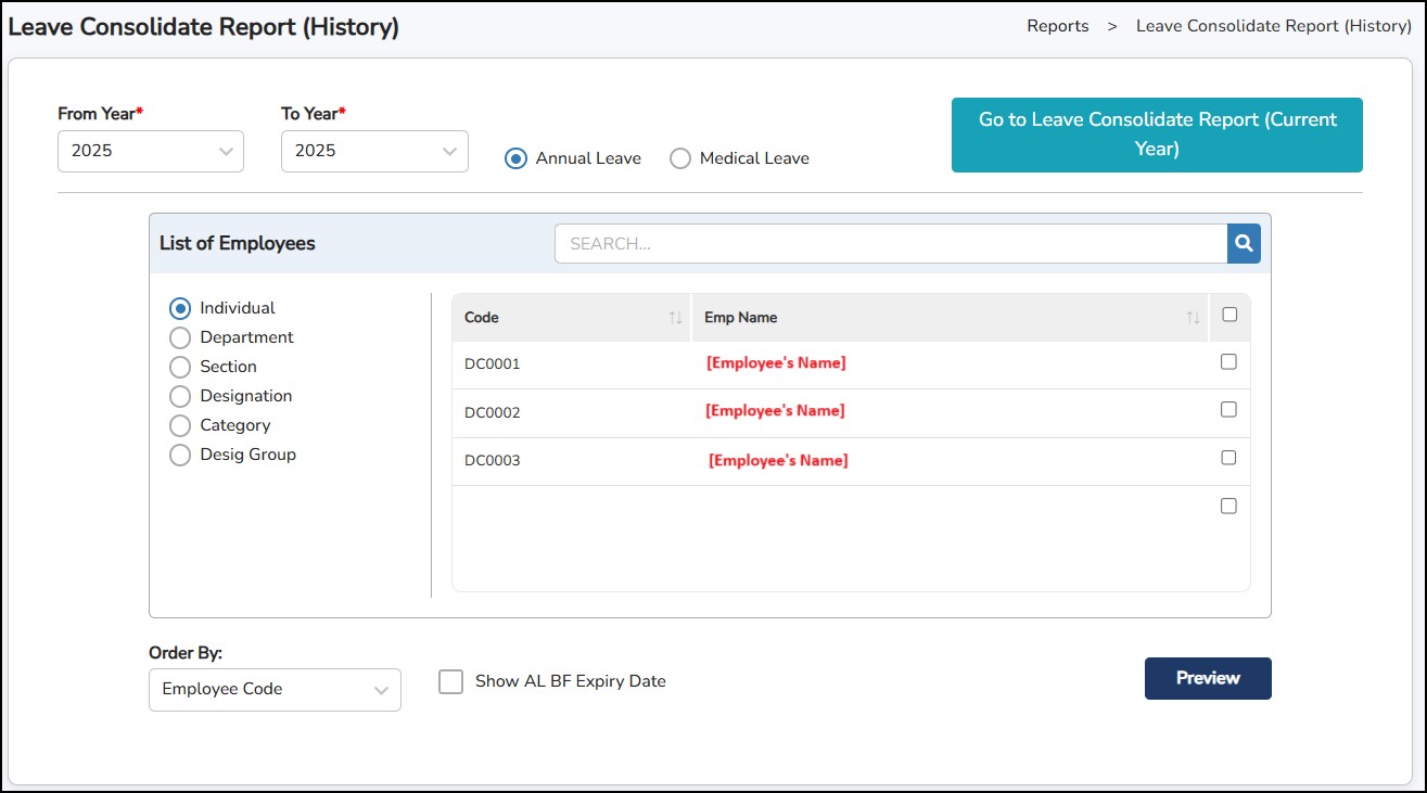Step 1: Go to Reports > Leave Reports > Leave Consolidate Report (Current Year).