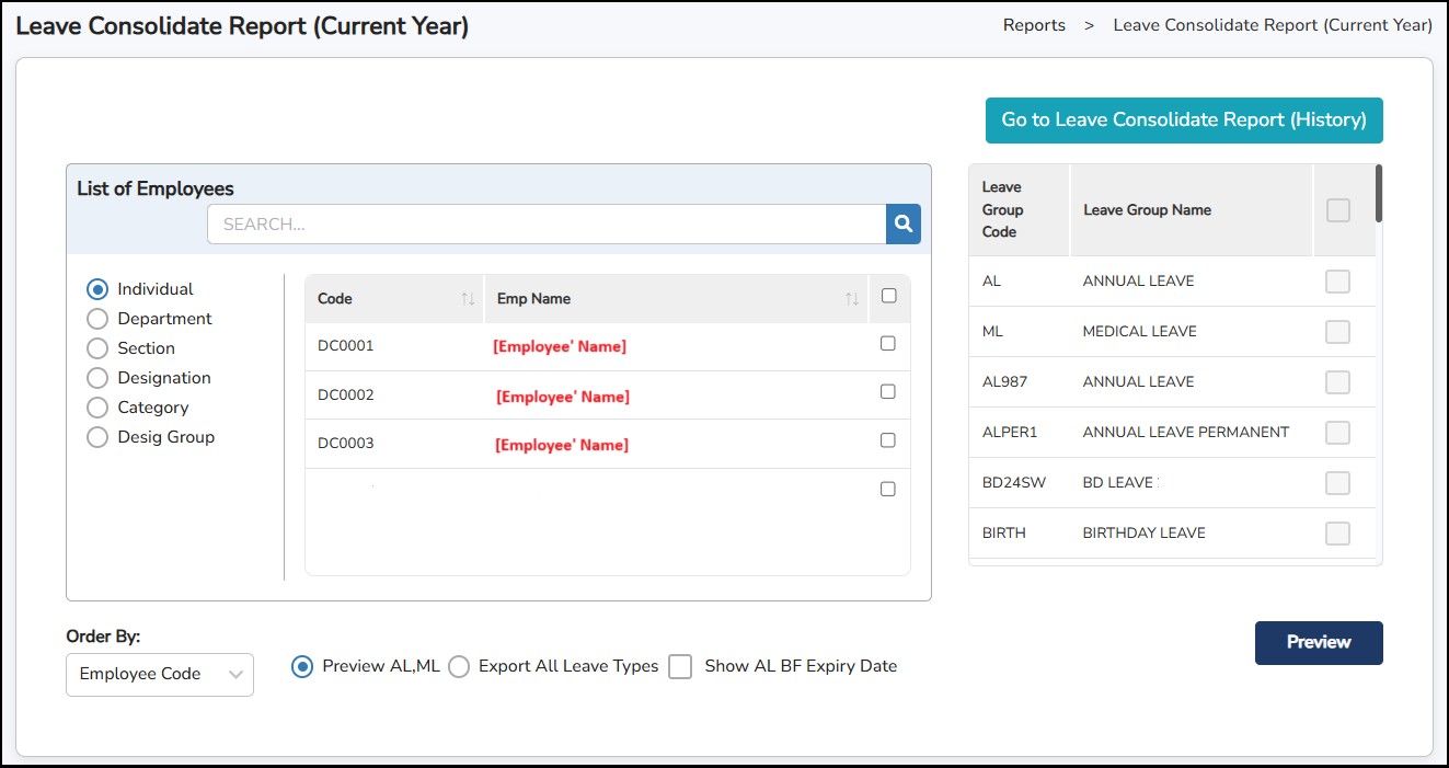 Step 1: Go to Reports > Leave Reports > Leave Consolidate Report (History).