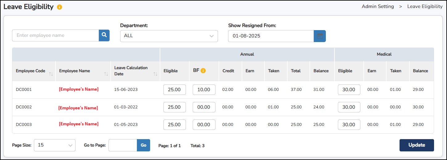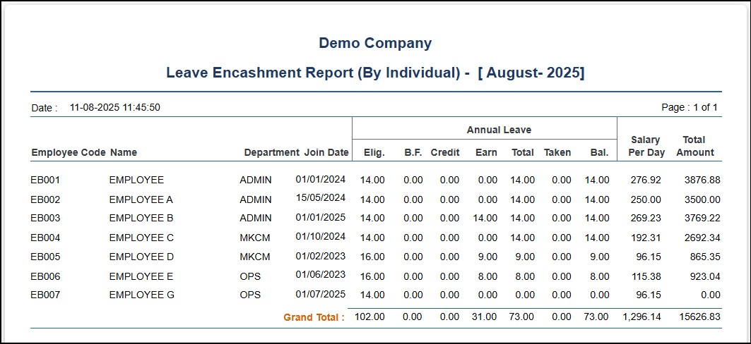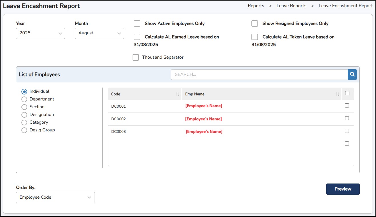 This Report is designed to assess employees with leave balances in the current year. Users will have the option to view all employees, or resigned employees leave encashment data, if any.