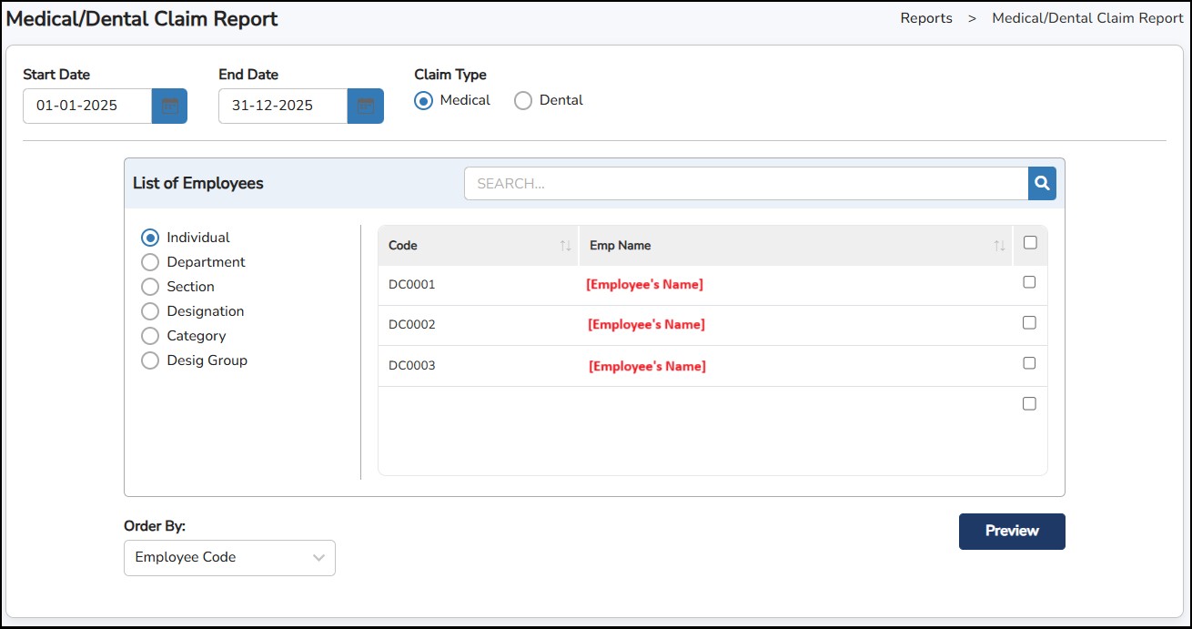This report is to generate any Medical or Dental Claim applied by the employees during the selected period.