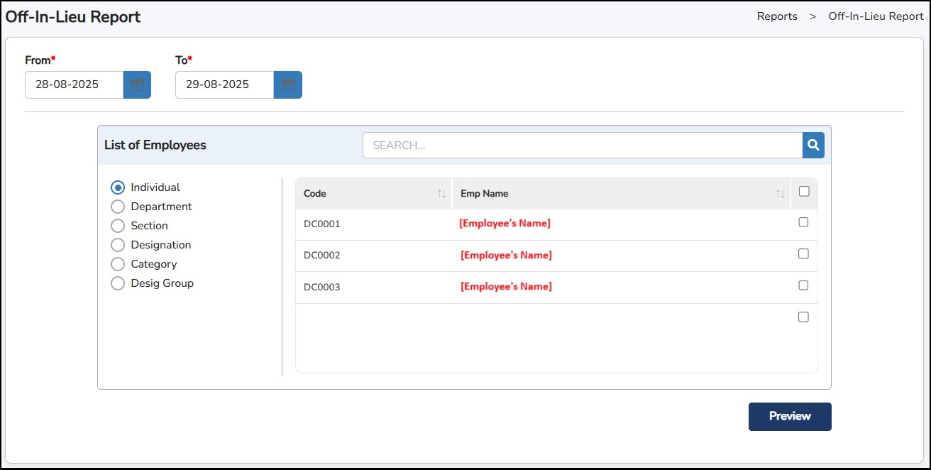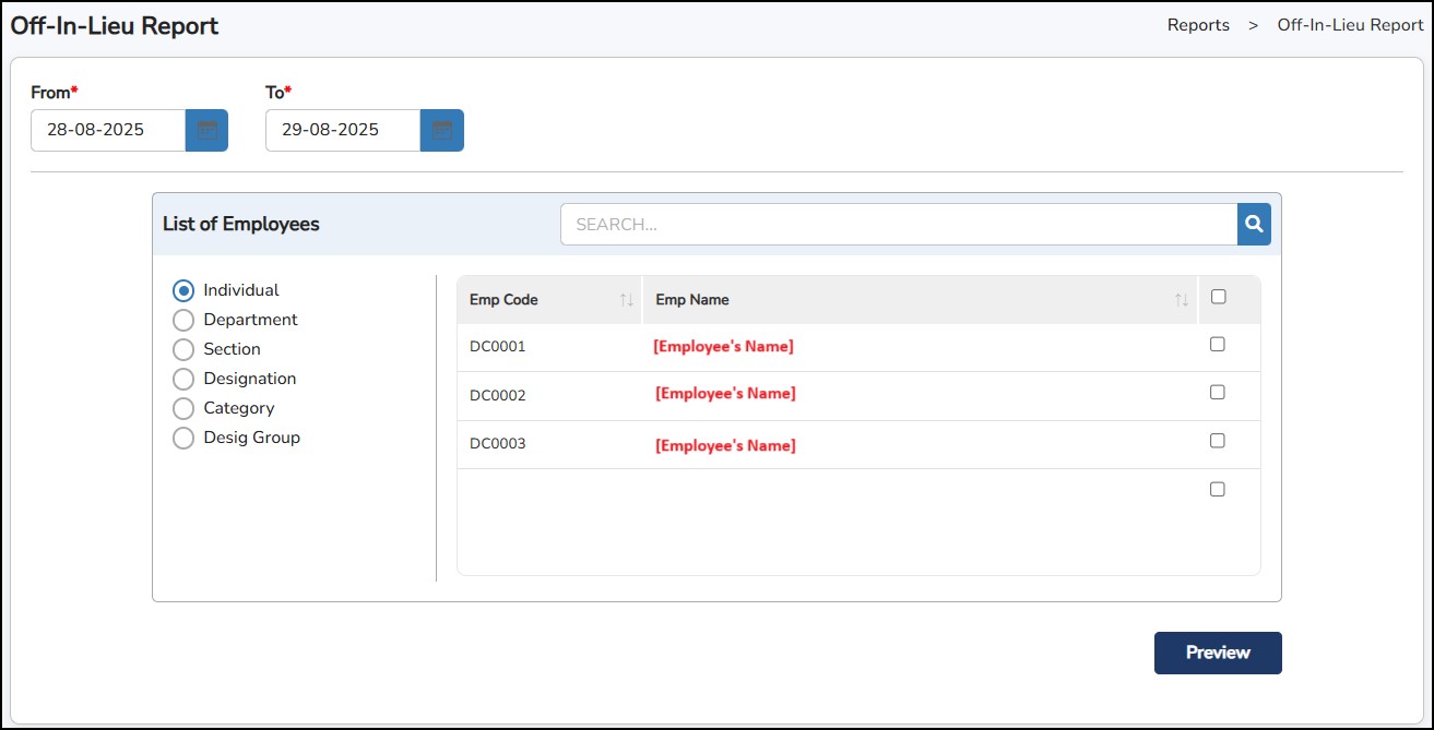 Step 1: Go to Report > Leave Reports > Off-In-Lieu Report.