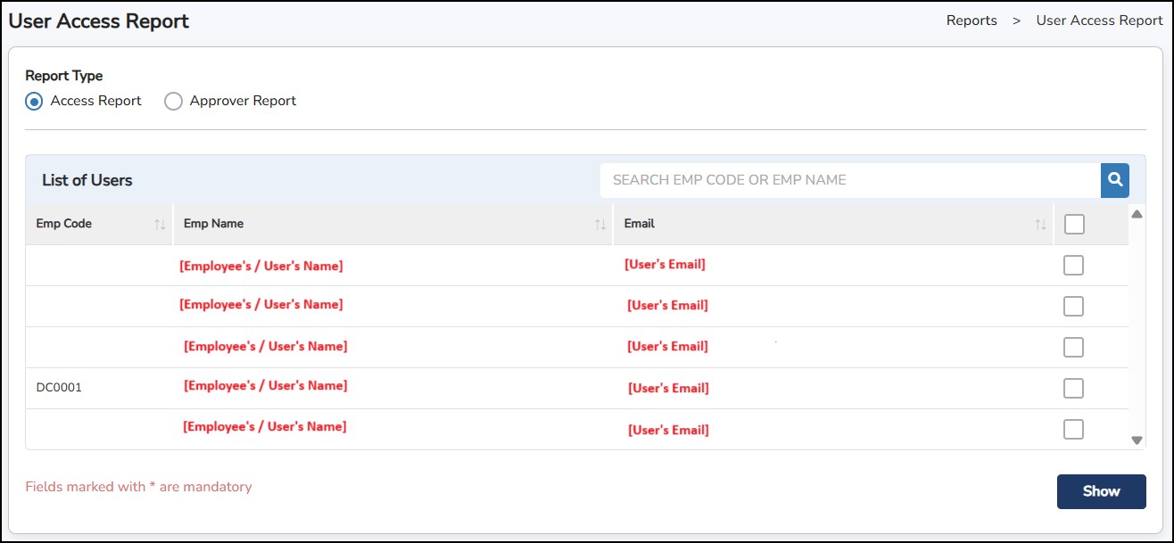 Step 2: Select the report type “Access Report” or "Approver Report".