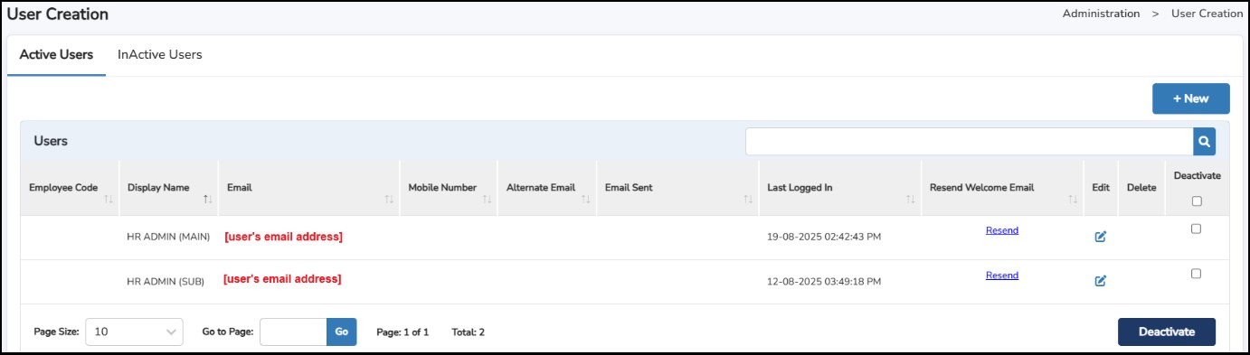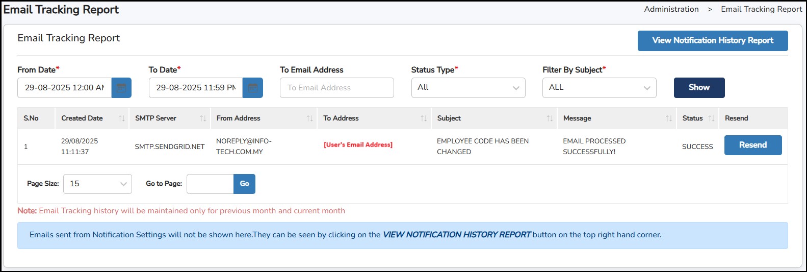 To reset the password for an employee, you may click on the Reset / Resend button and an email notification will be sent to the employee’s registered email ID indicating the Login User ID and Password.