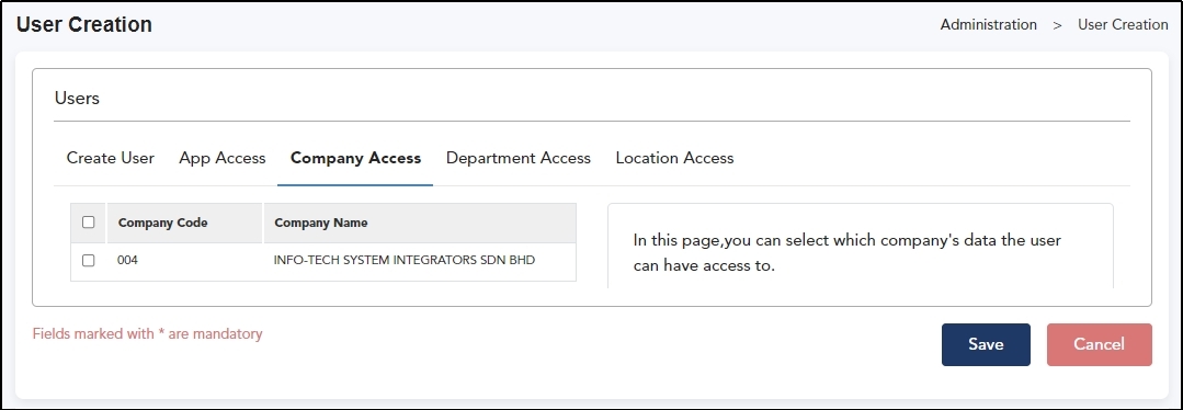 Step 4: Go to Company Access tab. Select which Company this user can access. If have more than 1 company, you can choose to allow this user either access to ALL company, or selected company only.