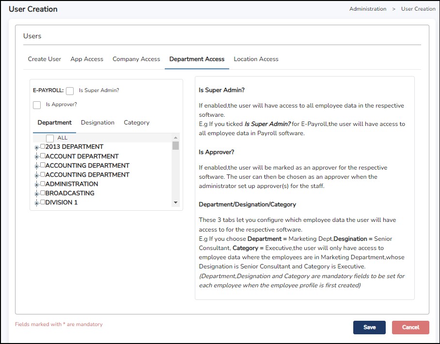 Step 5: Go to Department Access tab. Select which Department / Designation / Category that this user can access.