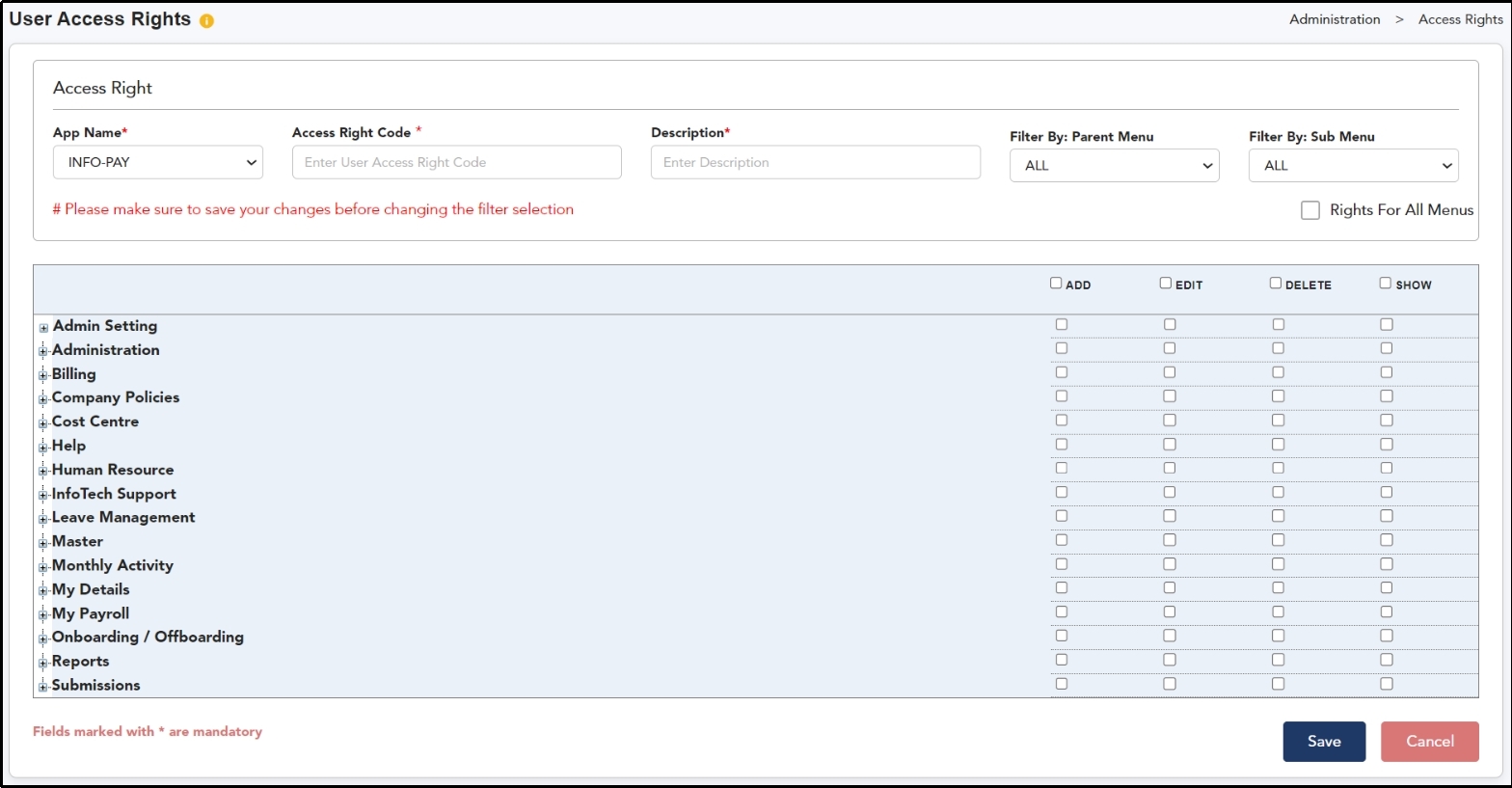 To create a set of access rights for someone who needs special access to the system (e.g., HOD, Approver, Supervisor, etc.), this is the place to do it.